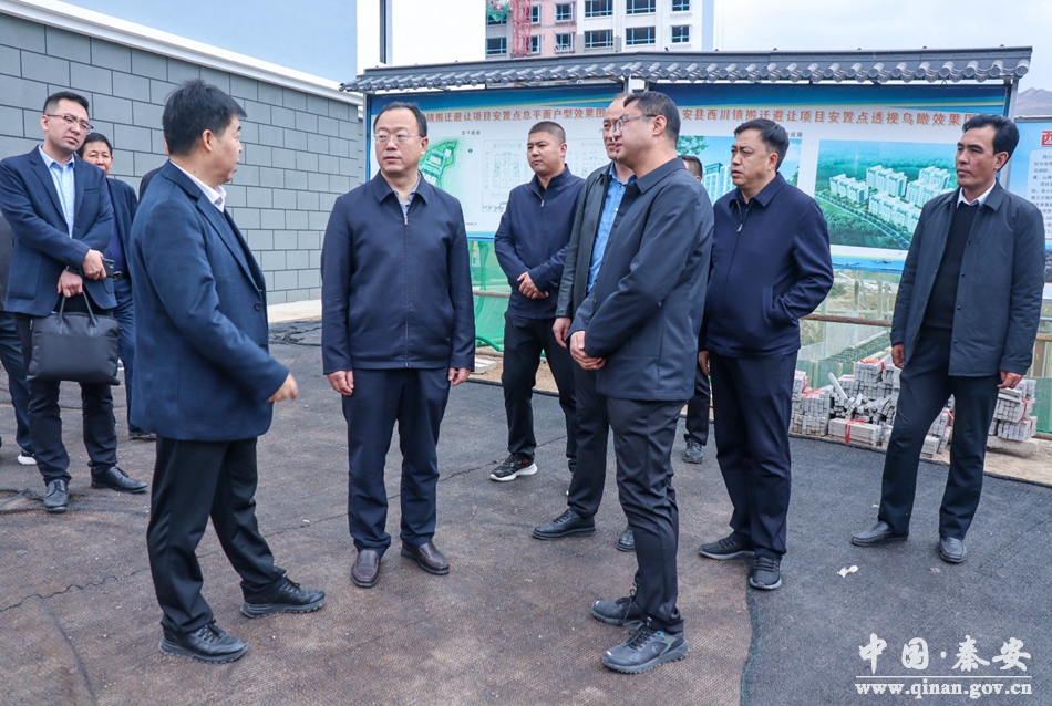 在西川镇生态及地质灾害避险搬迁项目施工现场,贾义翔详细了解了西川镇生态及地质灾害避险搬迁项目建设进展情况。