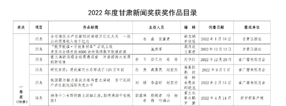 据了解,每年评选一次的甘肃新闻奖是全省新闻界综合性年度优秀新闻作品的最高奖。经过严格评审,2022年度共评出甘肃新闻奖获奖作品385件,其中一等奖78件,二等奖117件、三等奖190件。