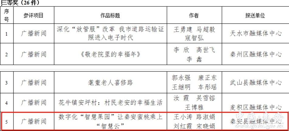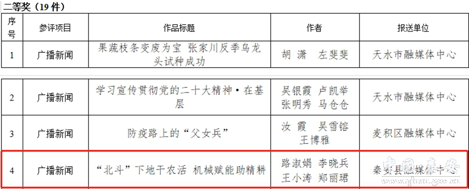日前,2022年度天水广播影视奖建议获奖作品名单公示,秦安县融媒体中心选送的7件作品获天水广播影视奖,其中广播新闻《我国科学家研制的“土壤固化剂”试验性道路在王窑镇开工建设》、电视新闻《工人深井作业昏迷被困 消防人员紧急施救脱险》、电视社教《中华文化从秦安走来》3件作品荣获一等奖。