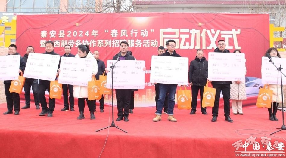 启动仪式上,县劳务输转服务中心负责人宣读了《秦安县2024年“春风行动”暨东西部劳务协作系列招聘服务活动方案》;甘肃融达安翔人力资源开发有限公司负责人代表中介机构作了发言;参会领导发放了由中国邮政秦安分公司和秦安县总工会为农民工代表赠送的火车票和爱心礼包。
