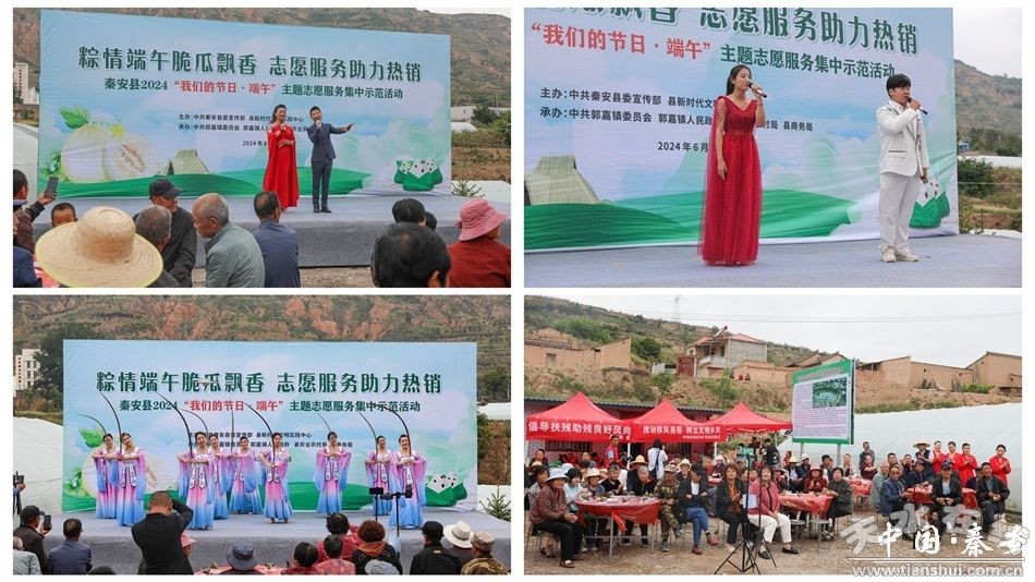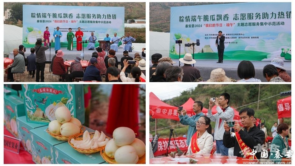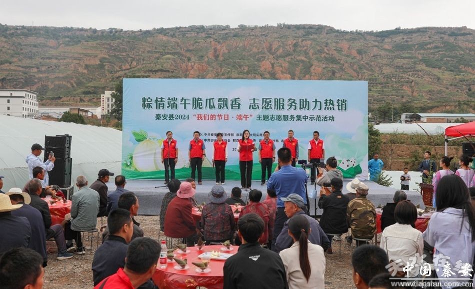 6月5日,秦安县在郭嘉镇洛泉村白脆瓜产业基地举行了“粽情端午脆瓜飘香·志愿服务助力热销”2024“我们的节日·端午”主题志愿服务集中示范活动。县领导马昊莹、任云飞、车晓珍、章春军,郭嘉镇和有关县直部门负责人,网红达人及电商企业、快递公司代表,郭嘉镇先进模范人物、镇村干部、群众代表参加活动。