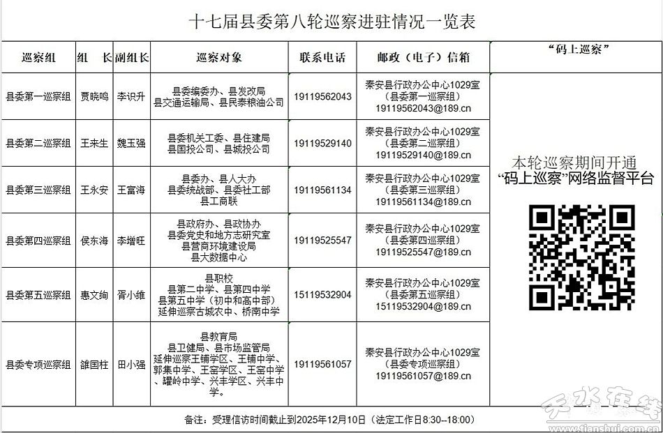 本轮巡察从2025年9月底开始,为期2个半月,县委巡察组受理信访截止时间为2025年12月10日。巡察期间,县委各巡察组分别设立专门信访电话、邮政信箱和电子邮箱,在被巡察单位设置意见箱、张贴巡察公告,开通“码上巡察”,主要受理反映被巡察党组织领导班子及其成员、下一级党组织领导班子主要负责人和重要岗位党员干部问题的来信来电来访,重点接受关于违反政治纪律、组织纪律、廉洁纪律、群众纪律、工作纪律和生活纪律等方面的举报和反映。其他不属于巡察受理范围的个人诉求、涉法涉诉等信访问题,将按规定转交有关部门处理。