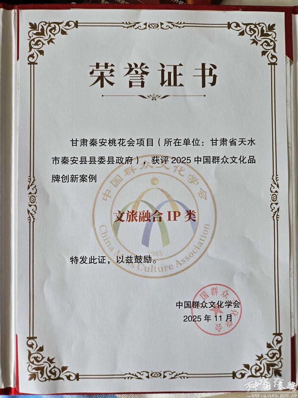11月7日,2025中国群众文化品牌发展大会在海南省三亚市举行。经过层层筛选和激烈角逐,甘肃秦安桃花会项目凭借其在文旅融合、产业赋能、文化传承等方面的创新实践与突出成效在全国各地722个群众文化品牌案例中脱颖而出,入选2025中国群众文化品牌创新案例——文旅融合IP类案例,成为县域群众文化品牌高质量发展的典型标杆。秦安县委常委、宣传部部长陈升在大会上做了宣传推介,县政府副县长张百年参加大会。