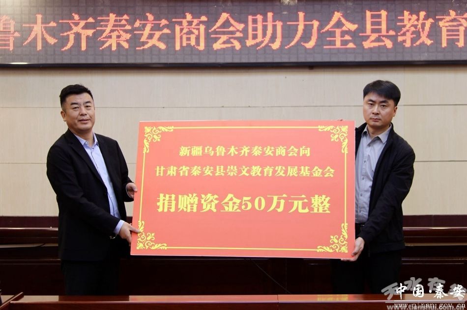 会上,新疆乌鲁木齐秦安商会会长任继鹏介绍了商会发展情况,并向甘肃省秦安县崇文教育发展基金会捐赠资金50万元。