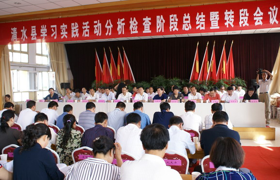 按照省委,市委的统一安排部署,7月9日,清水县召开全县学习实践分析检查阶段总结暨整改落实阶段动员会,总结分析检查阶段的工作,汇报交流机制创新工作,安排部署整改落实阶段的工作。同时传达贯彻市委五届六次全委(扩大)会议精神,安排部署了后半年全县重点工作。