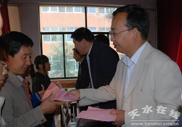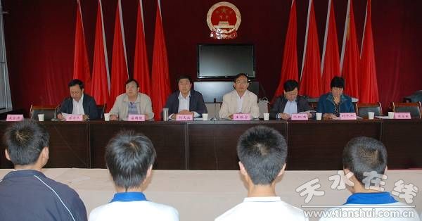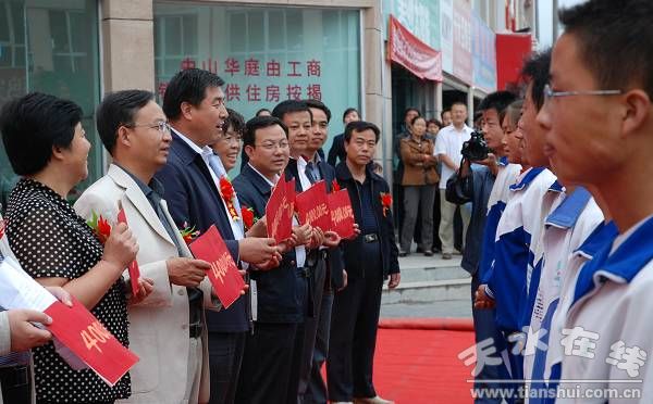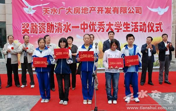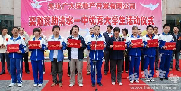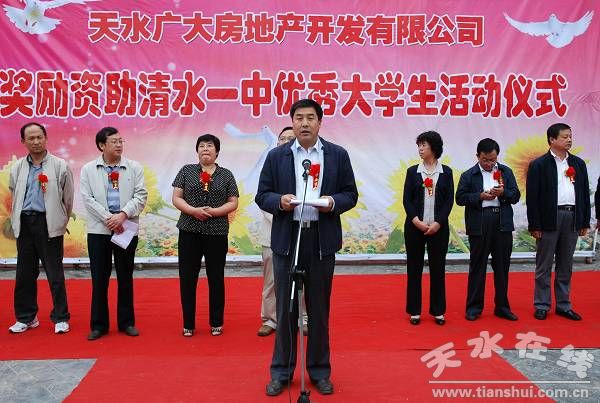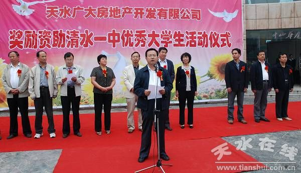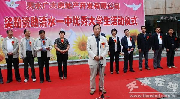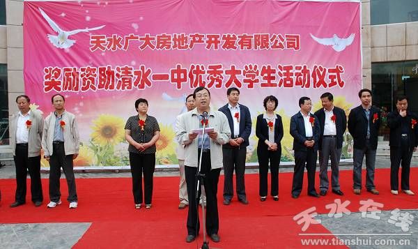 县委书记王振宇宣布“天水广大房地产开发有限责任公司奖励资助清水一中优秀大学生活动开始”,县委副书记、县长刘天波作了重要讲话,县委常委、纪检委书记妥国保主持仪式,副县长蔡俊杰宣读了受助学生名单。