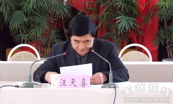 (县人大常委会副主任汪天喜宣读《清水县社会治安综合治理委员会、清水县见义勇为协会关于表彰见义勇为先进单位和先进个人的决定》)