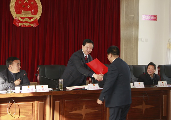 (县人大常委会主任阮珠有为新任职的29名同志颁发任命书 )