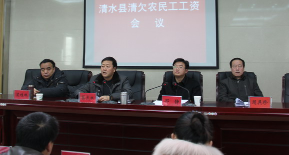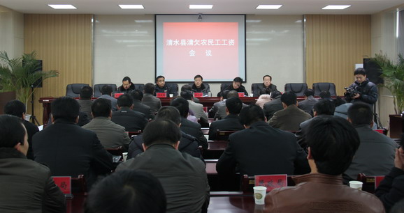 为了切实维护农民工合法权益,全面清理农民工工资的拖欠情况,进一步建立健全保障农民工工资支付的长效机制,确保2011年元旦、春节期间农民工工资按时足额发放,全力维护社会稳定。12月31日,清水县召开清欠农民工工资工作会议。县委常委、副县长蔡虎林,县委常委邢静,县人大副主任梁桂林,县政协副主席周具珍出席会议。18乡镇党委书记、人社局、财政局、住建局、公安局、交通局、法院、工会等单位主要负责人和在清施工、房产开发企业负责人参加了会议。