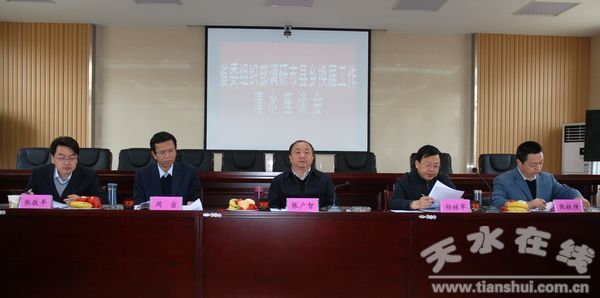随后,在清水县政府视频会议室召开了市县乡换届工作座谈会,清水县委书记王振宇就清水县组织工作和县乡换届准备工作做了汇报,他说,近年来,清水县紧紧围绕全县工作大局,按照“常规工作打基础、重点工作创特色、难点工作求突破、整体工作上台阶”的总体思路,坚持抓班子、带队伍、抓基层、打基础、建基地、聚人才,全面加强领导班子和干部队伍建设、基层党组织建设、人才队伍建设,为促进全县经济社会又好又快发展提供了坚强有力的组织保证,突出实践活动特色,学习实践科学发展观活动成效显著;着眼体制机制创新,干部人事制度改革进一步深化;积极搭建创业平台,人才工作的促进保障作用日益显现;坚持抓基层打基础,基层党建工作取得新进展,通过围绕经济抓党建、抓好党建促发展,全县经济社会等各项事业呈现出良好的发展势头。2011年,我们紧紧围绕推动全县经济社会跨越式发展,突出县乡党委集中换届这一中心,着力抓规范、抓落实、抓提升,以集中换届带动领导班子和干部队伍建设,以创先争优活动带动基层党组织和党员队伍建设,以实施人才《规划》带动人才队伍建设,以优良作风带动风清气正的换届环境,统筹推进干部人事制度改革、党内民主建设和组工干部队伍建设,以改革创新精神推动基层组织建设,为全县“十二五”规划开好局起好步提供坚强的组织保证。