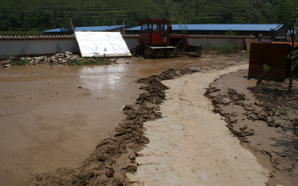 红堡镇后川养猪场被洪水冲漫,养猪场内积满淤泥