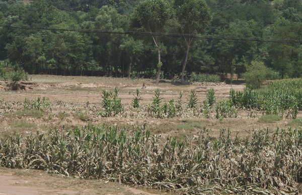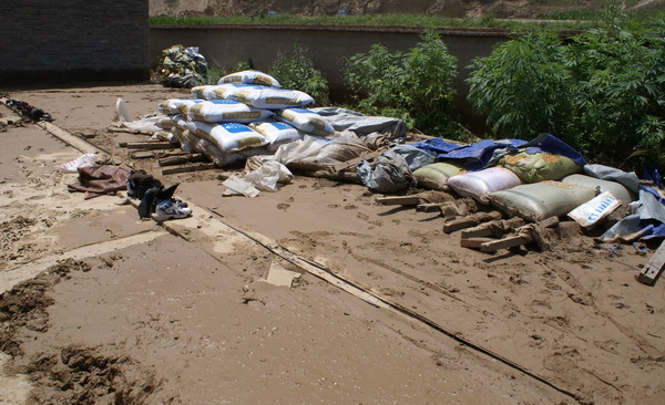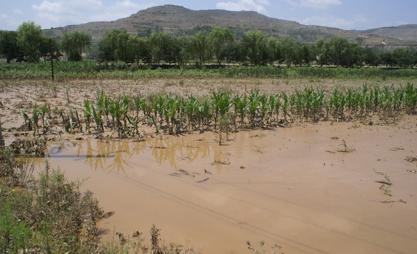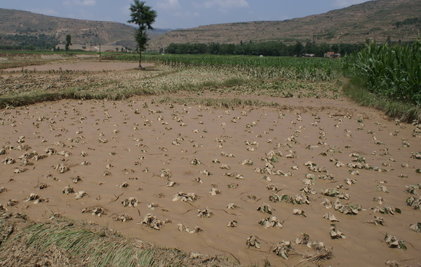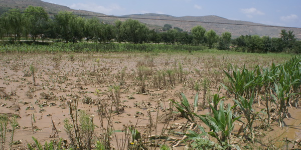 后川河流域受灾十分严重,沿河道附近的农作物被洪水冲毁