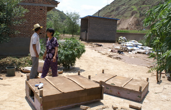 红堡镇后川养猪场被洪水冲漫,正在全力清淤,晾晒被洪水浸泡过的饲料和家具