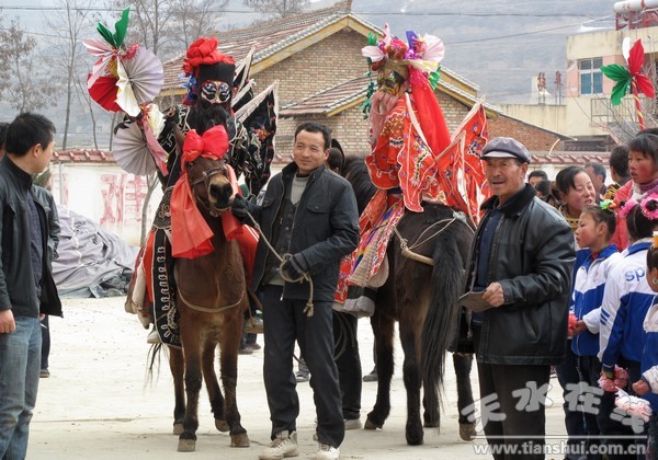 农历正月初九,据说是玉皇的诞辰日,是黄门乡九台山道教圣地的庙会日,上午10时许,周边乡镇及村组的人们扶老携幼三五成群云集九台山,烧香祈福。各自然村以及群众自发组织的社火表演更是吸引眼球,高大雄壮的狮子带着一群小狮子进场了,它们在空地上奔跑跳跃,争抢绣球,被迫围观的人群往后退以便让出表演的场地;看,扮演大头娃娃的大哥哥们上场了,他们憨态可掬而滑稽的表演,让所有在场的人都笑弯了腰;彩车、马社火、舞蹈、秧歌、秦腔表演等更是丰富多彩,让人目不暇接。