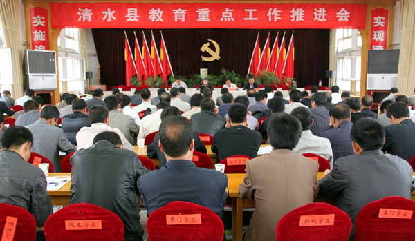 5月20日,清水县召开全县教育重点工作推进会,传达贯彻落实全市教育重点工作推进会精神,安排部署加快推进学前教育、校安工程项目、薄弱学校改造计划、学生营养改善计划、高中新课改、高考中考备考、校园安全及防汛等教育重点工作。