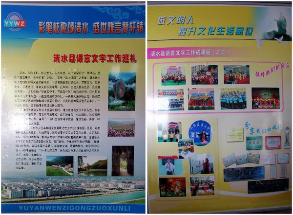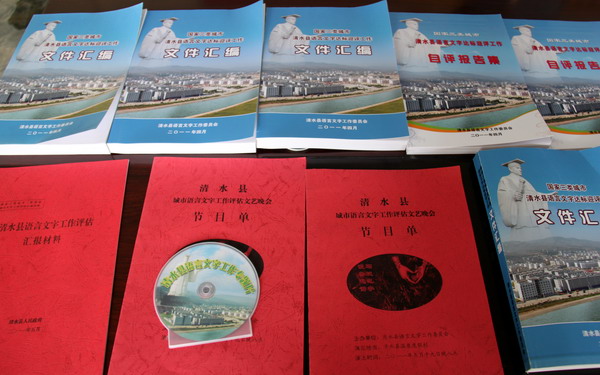 近年来,清水县在省、市语委的精心指导下,以迎接国家三类城市语言文字评估工作为契机,以《甘肃省二三类城市语言文字工作评估指标体系》及《评分细则》为依据,创新工作思路,健全组织机构,完善工作措施,积极深入宣传、贯彻《国家通用语言文字法》,广泛开展语言文字规范化系列活动,不断增强全县广大干部、群众的语言文字规范意识,为推进全县经济社会跨越式科学发展、构建和谐清水营造了良好的语言文字环境。经过全县广大语言文字工作者的辛勤努力,去年5月,清水县顺利通过了国家三类城市语言文字工作的评估验收。