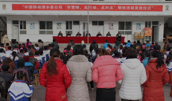 1月8日,天水移动公司 “学雷锋、见行动”“点对点”帮扶活动发放仪式在草川乡中心小学举行。天水市移动公司副总经理蔡瑞峰、清水县政府副县长何敬忠出席发放仪式,县教体局、草川乡中心小学全体师生参加了帮扶助学发放仪式。