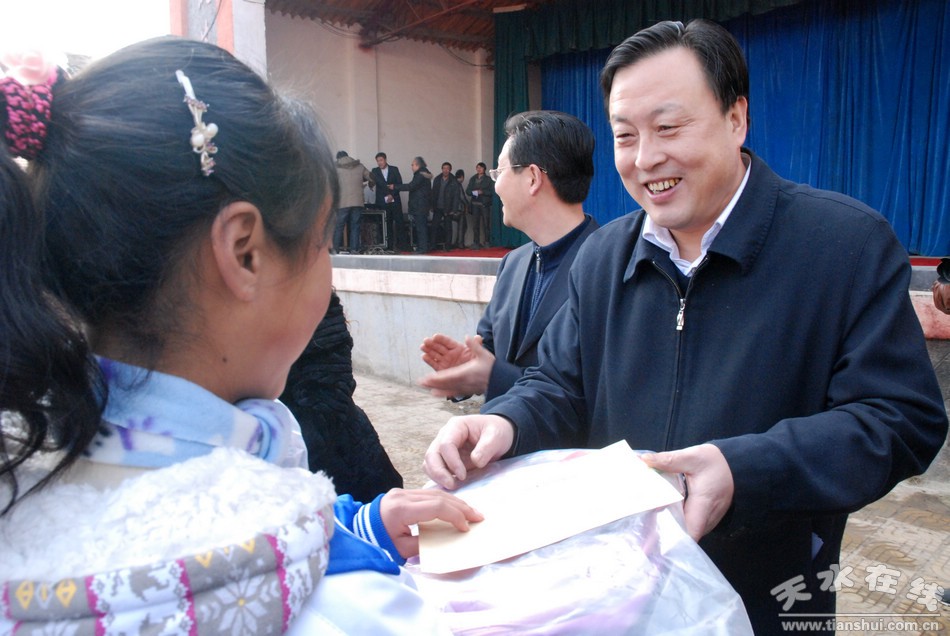 (市政府副秘书长张有信为贫困学生发放学习用品)