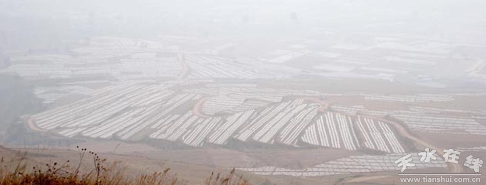 转眼看去,垄垄地膜犹如条条银丝带,排列的整整齐齐。站在山顶俯视,满山遍野的银白色就像落了一层薄薄的雪,在浮尘大雾的映衬下,像是冬日飞雪再现。画面中,到处是农民忙碌的身影,覆膜、挖坑、种树……