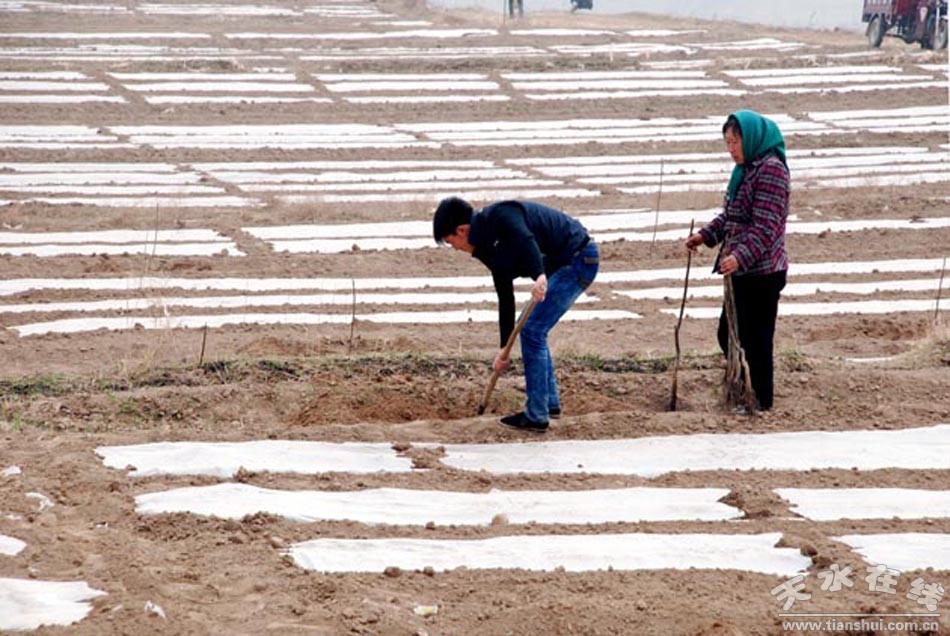 (图为清水县红堡镇村民正在自家的全膜双垄沟播玉米地里套种核桃树)