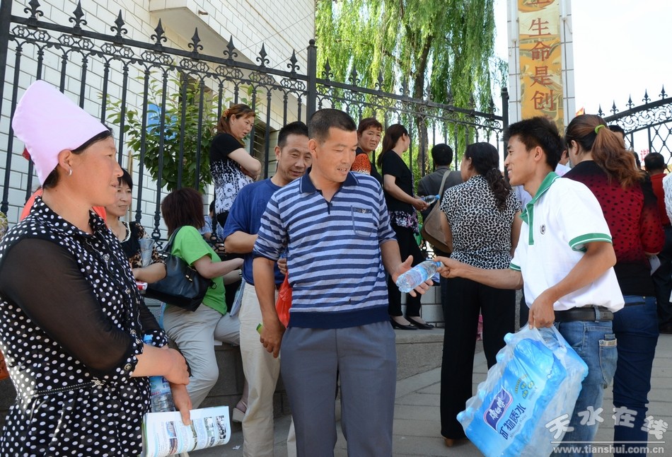 (金徽酒业工作人员为等候考生的家长和考生免费送水) |