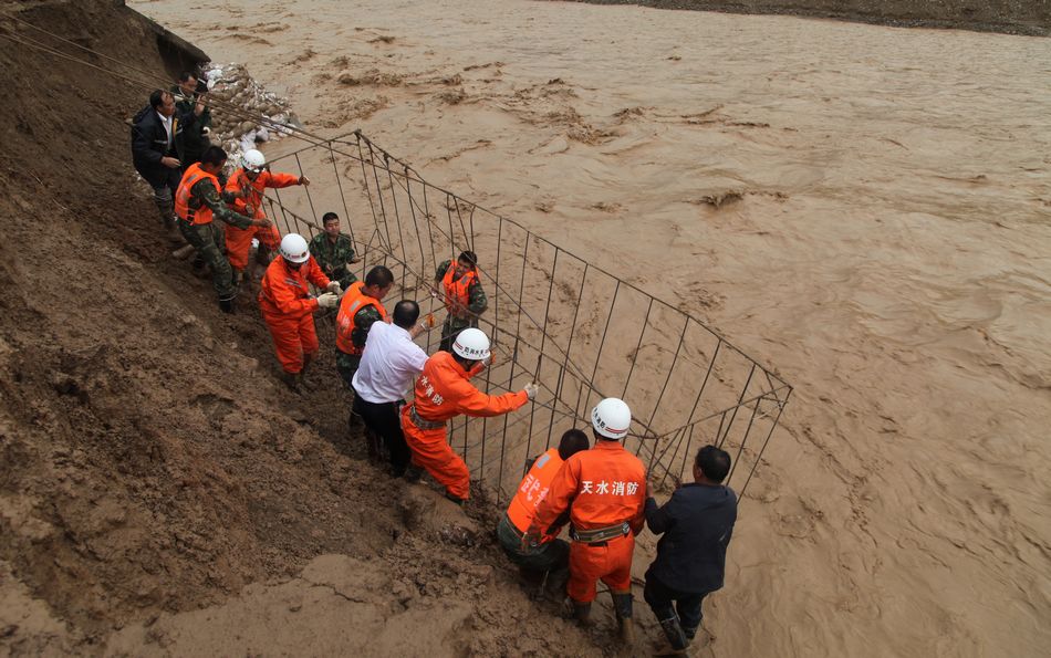 (干部职工正在抢修堤防)