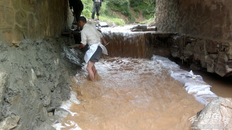 7月22日,清陇公路3公里处、4.5公里处、5.3公里处和扫帚沟南道河桥头共计300多米路基冲毁,道路多处中断。洪水像发疯了猛兽,向扫帚沟南道河桥猛烈冲击,桥东端路基冲毁10米,U型桥台的填充物被洪水冲走,桥头随时有垮塌的危险。技术负责人王亚军将具体情况向他汇报后,他马上联系调来2台挖掘机、2台装载机、3辆翻斗车、1台压路机,一边火速抢通便道,一边仔细勘察南道河桥受损情况。针对受损程度高,受灾点密集,救灾难度大的特点,赵建峰和技术人员一道研究抢修方案,大家讨论认为快速抢通道路,保住大桥最重要,对U型桥台采取钻孔注入法最有效,即在桥头搭板上钻取三个孔,再把商砼注进去快速凝固,把桥头固定住。方案定下了,执行的力度和速度就是能否取得胜利的关键。为了提高效率,他们根据方案做了分工,赵建峰负责调运材料,王亚军负责现场作业指挥。他们轮流不间歇地施工,饿了吃饼子夹榨菜、渴了就喝矿泉水,困了就躺在拉东西的皮卡车里闭一会眼。经过40多个小时的奋战,向桥基灌注商砼5车,桥台得到加固保住了,回填土方2万多方,塌方道路全部修复,及时保证了陇东乡抢险救灾生命线的畅通。
