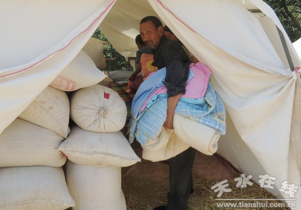 (临时安置点的老人领到了棉被、褥子等救灾物资)