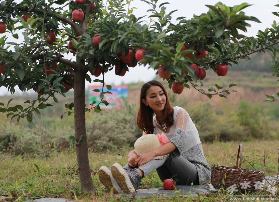 (图为来自清水县的机关干部王丽君客串“苹果模特”,为柏树村的优质苹果代言。)