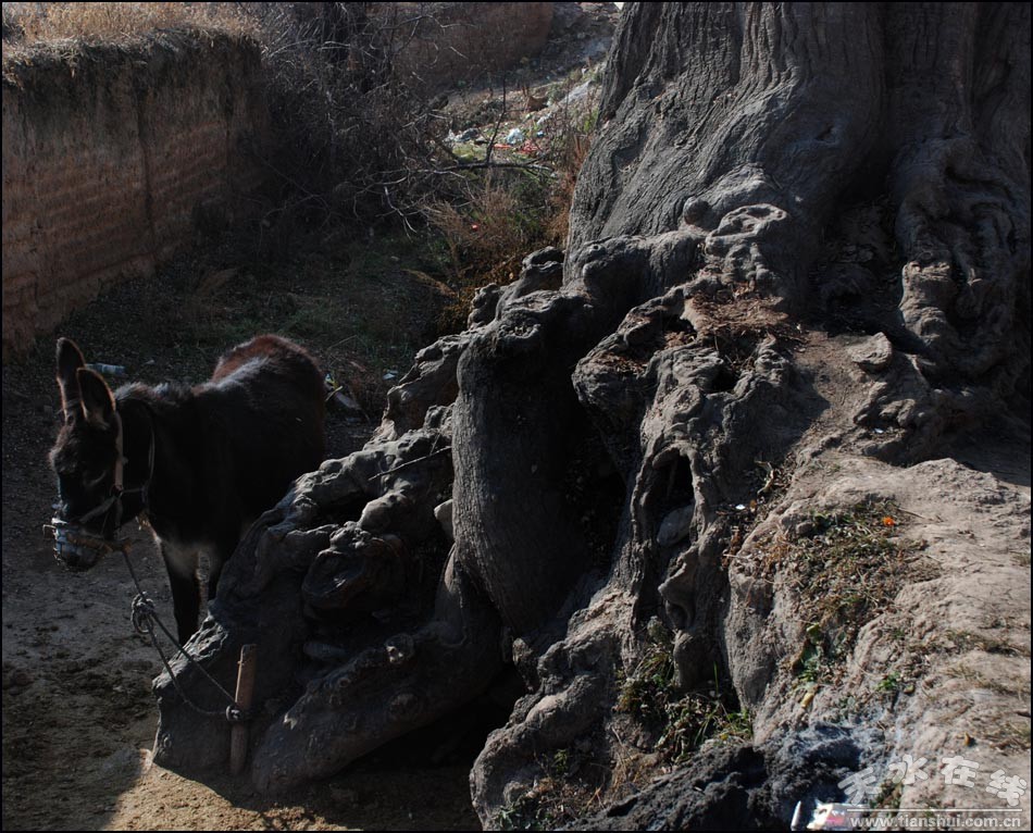 (一头毛驴拴在600年古槐树裸露的树根上)
