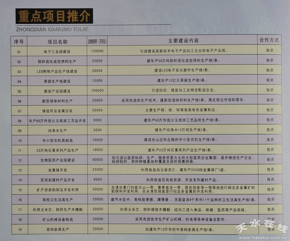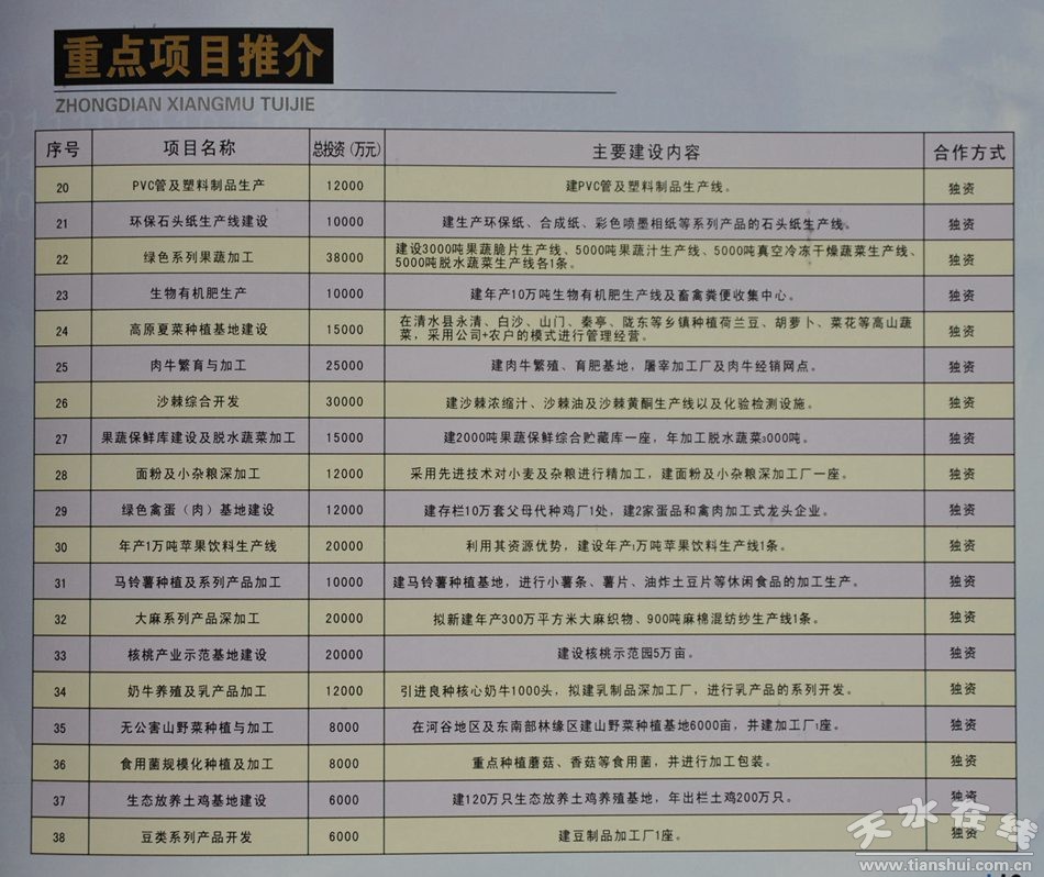 在本届兰洽会重点招商项目推介会上,清水县依托自身生产优势、产业优势、资源优势、区位优势、环境优势、政策优势和服务优势,向各地客商重点推介电子加工、矿产资源开发、建材生产、农产品深加工、旅游开发等方面的招商引资项目56项,诚邀各地客商洽谈项目,投资合作,共谋发展。