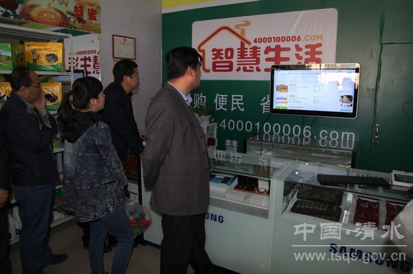 考察团先后深入清水县集群电子商务有限公司轩辕广场智慧生活体验馆、红堡镇小泉村福乐商行加盟店、贾川乡商行体验加盟店、金集镇智慧生活体验馆、郭川乡商行体验加盟店,通过现场体验、观摩交流、听取情况介绍等形式,详细了解了清水县近年来电子商务发展运行情况。