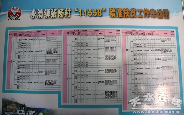 走进清水县永清镇张杨村委会,看到了一沓沓整理摆放好的扶贫资料,不远的墙上还挂着《“11558”精准扶贫工作作战图》、《“11558”精准扶贫农户分类图》,图表上详细地列出了张扬村扶贫攻坚的对象、内容、目标、措施及进展情况等,目标清楚、任务明确,而这些图表也将成为这个村目前及今后开展精准扶贫工作的“作战图”。