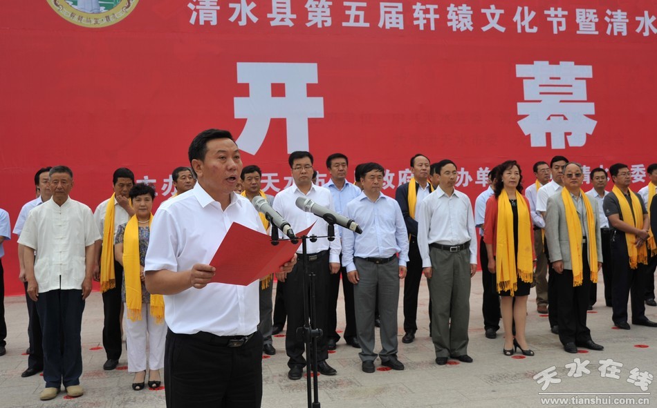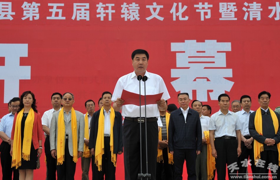 天水市委副书记、市长杨维俊作了讲话,杨维俊说,天水是中国历史文化名城,是羲皇故里、女娲故里、轩辕故里。大力传承和弘扬伏羲、女娲、轩辕等始祖文化,是建设全球华人寻根祭祖圣地和华夏文明传承创新区的必然要求,也是加快丝绸之路经济带建设、促进文化旅游深度融合发展的重要举措。清水县自2006年开始举办轩辕文化节以来,已成功举办了四届,规模和影响逐年扩大。作为敦煌行·丝绸之路国际旅游节系列活动之一,清水县第五届轩辕文化节暨清水温泉养生旅游节的举办,对于宣传推介清水乃至全市、全省的始祖文化旅游品牌,扩大对外开放,加强交流合作,促进转型发展,必将产生积极而重要的影响。