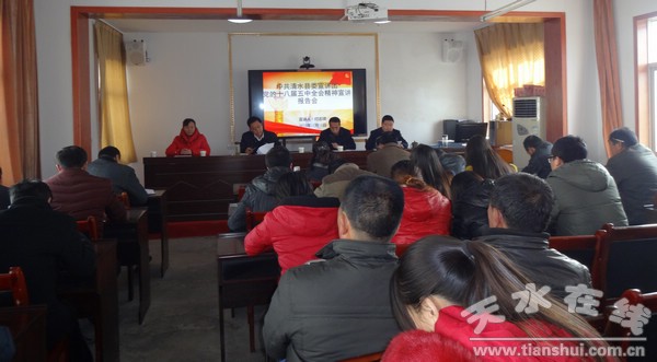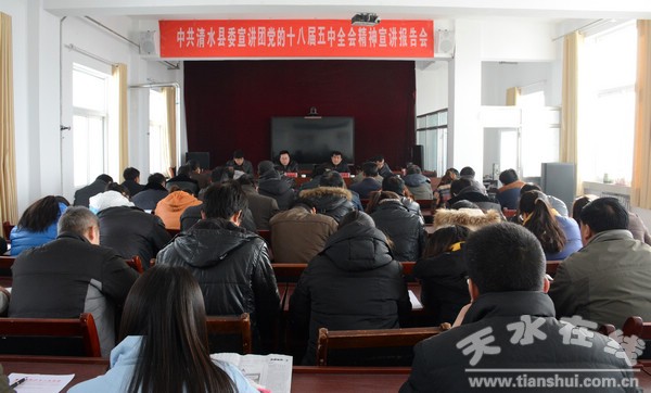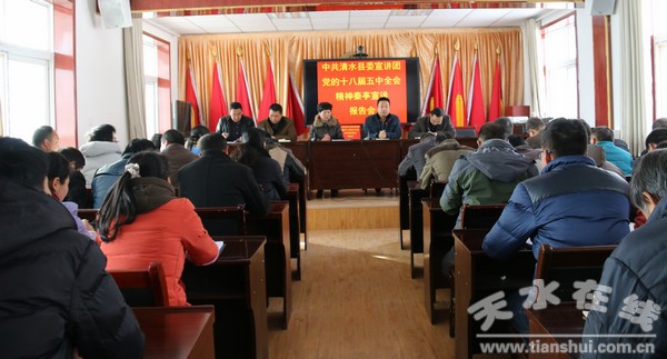 12月15日,清水县委党的十八届五中全会宣讲团先后深入白沙、秦亭、白驼、黄门、贾川等乡镇,宣讲十八届五中全会精神,各乡镇党委领导班子成员、全体干部、各行政村党支部书记及乡(镇)属机关单位负责人聆听了报告。