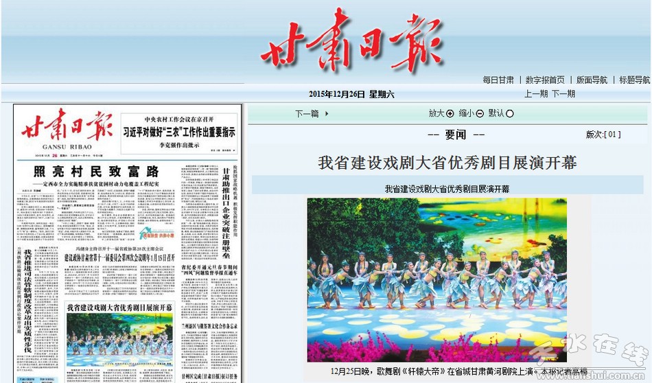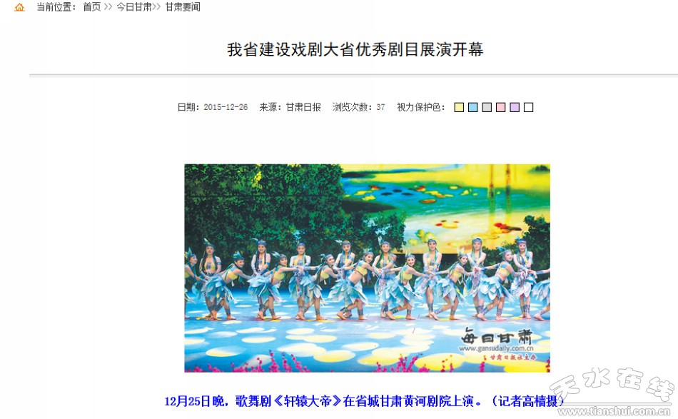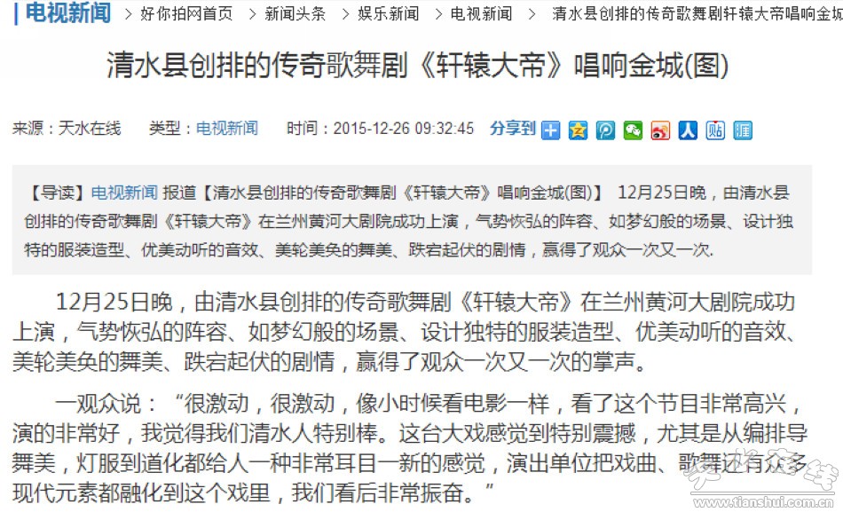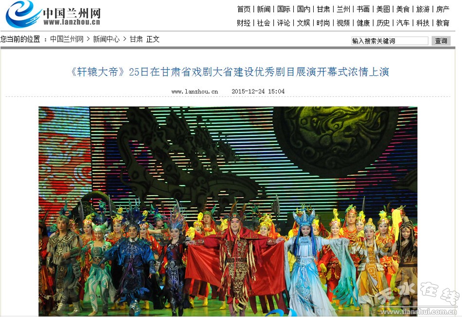 12月25日,清水省县打造的歌舞传奇剧《轩辕大帝》在甘肃黄河剧院浓情上演。《轩辕大帝》的成功演出,吸引了人民网、新华网、中新网、甘肃日报、甘肃电视台、中国甘肃网、每日甘肃网等十余家中央驻甘及省、市级新闻媒体争相报道,同时,搜狐新闻、网易、商洛传媒等多家网站对演出情况进行转载报道。