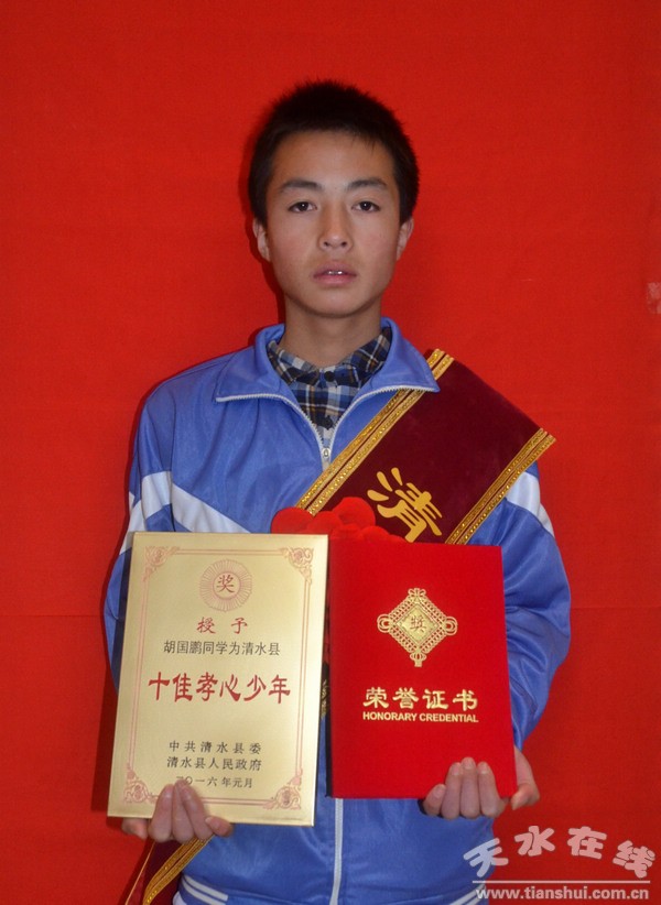 在清水县清水县新城乡中学,有这样一位少年,他品学兼优,乐观向上,团结友善,乐于奉献,在家里,他更是一个孝敬爷爷奶奶,帮助父亲的好孩子。他是一个全面发展、学有所长的好少年,以良好的思想品质,优异的学习成绩,全面发展的综合素质,成为同学中的佼佼者。他就是家住新城乡王尧村胡山组的胡国鹏。