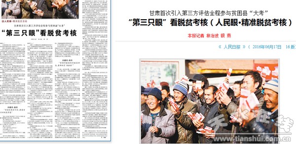 人民日报6月17日以《甘肃首次引入第三方评估全程参与贫困县“大考”》为题,报道了甘肃省在考核精准扶贫工作中的先进做法经验,其中就以清水县郭川镇青莲村精准扶贫户尚存宝为例报道了甘肃省清水县精准扶贫户识别精准。