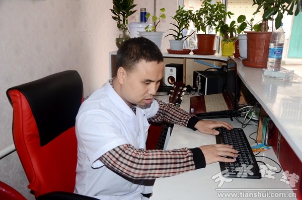 今年30岁的高彦平出生在清水县白驼镇林屲村一个普通的农民家庭,全家过着面朝黄土背朝天的生活。高彦平的童年是不幸的,先天性双目失明不仅夺去了他健康的身体,同时也吞噬了他童年的欢乐。“作为一个盲人,跟村里的同龄人是玩不到一块的,他们玩的时候也不带我,所以我小时候经常一个人待在家里,只有父母时不时带我出去走走,那时的我非常的自卑,”听着远处同村的伙伴们相互嬉戏玩耍,他总是情不自禁的感到一阵难过,面对这些现实,幼小的他无能为力,只有在煎熬中成长。时间一天天过去了,高彦平也一天天长大了,而这时,上天也给他打开了窗户,就在他13岁的时候,有一天,清水县残联的工作人员到村里开展工作,了解了他的情况后,就推荐他到天水市盲聋哑学校学习,就这样,高彦平带着希望与忐忑,第一次离开了家,离开了父母。