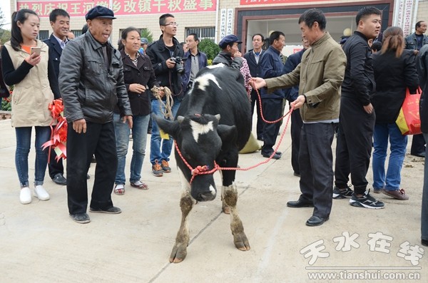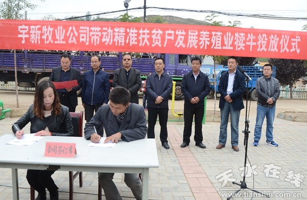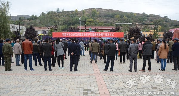 10月10日,宇新牧业带动精准扶贫户发展养牛业犊牛投放仪式在清水县王河镇隆重举行。县委副书记、县政协主席王新强出席了仪式并做了讲话,县扶贫办、财政局、畜牧局、镇村两级干部、46户肉牛养殖户及部分群众代表共200余人参加了投放仪式。