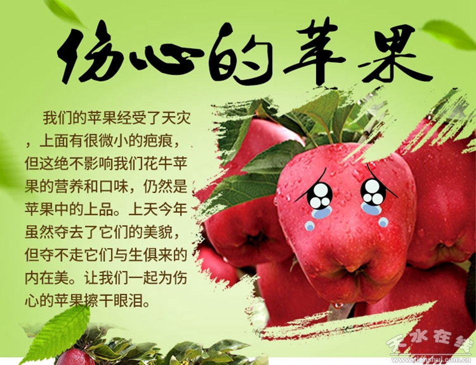 今年6月,清水县郭川、金集、远门、丰望等苹果主产区域遭受冰雹灾害。进入成熟期后,苹果表面出现凹凸、黑点,苹果品质好,但品相难看,致使大量苹果采摘后无人问津,大量堆积,果农十分焦虑。