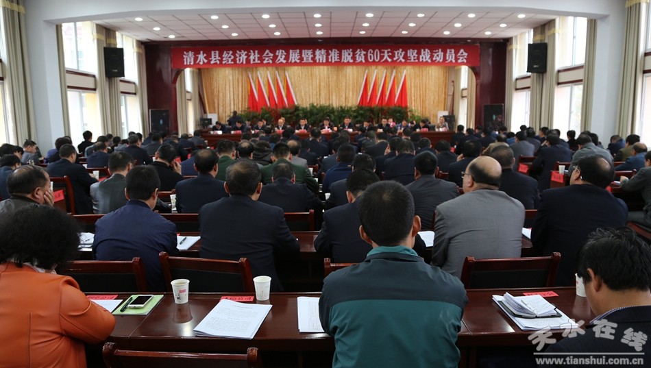 10月25日下午,清水县委书记刘天波主持召开全县经济社会发展暨精准脱贫60天攻坚战动员会。会议贯彻落实刚刚闭幕的县党代会和“两会”精神,进一步号召和动员全县各级党政组织和广大干部,抢抓全年仅有的两个月有效工作时间,决胜第四季度,争分夺秒会战60天,大干60天,冲刺60天,狠抓各项重点工作落实,努力完成全年目标任务,不断开创各项事业新局面。县四大组织在家领导出席会议。