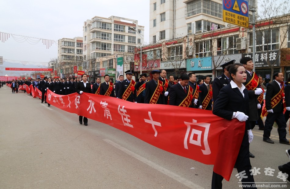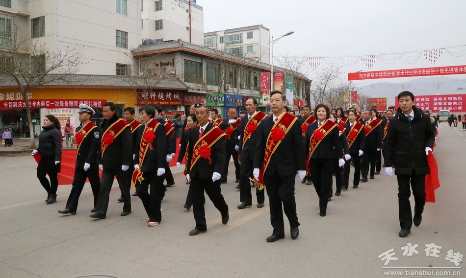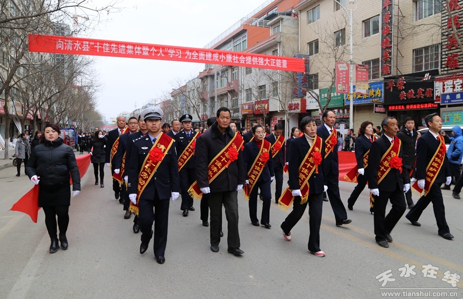 1月18日下午,清水县在轩辕广场隆重举行2016年“十佳先进集体暨个人”风采展示活动。刘天波、马越垠、周伟东、丁旺喜等县四大组织领导为122名受表彰的十佳先进集体代表及个人颁发绶带、佩带红花,在县城主干道向全县广大干部群众展示风采,进一步激发全县上下尊重先进、崇尚先进、学习先进、争当先进的强大正能量。