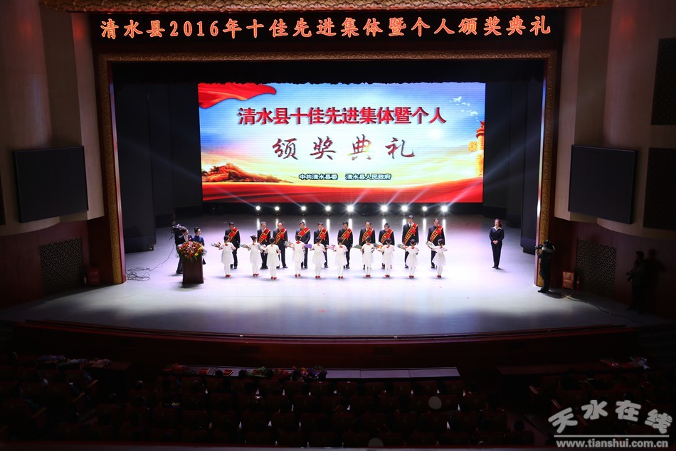 1月18日,清水县举办了2016年“十佳先进集体和个人”表彰大会暨颁奖典礼,一个个感人事迹感动了现场观众。他们当中有弘扬中华传统美德、敬亲孝老的贤惠媳妇;有苦干实干、贡献突出的劳动模范;有一心为了病人、救死扶伤的医护楷模;有甘于清贫、苦育桃李的最美教师;有立志成才、品德高尚的孝心少年;有敢为人先、致富带富的创业先锋;有创造财富、乐善好施的爱心人士;有捍卫忠诚与责任的公安干警;有环境优美、产业良好、村风文明的美丽新村。他们有着一个共同的特点,就是坚定“中国梦”,甘做“铺路人”,在平凡的岗位上做出了不平凡的贡献,创造了不平凡的业绩。
