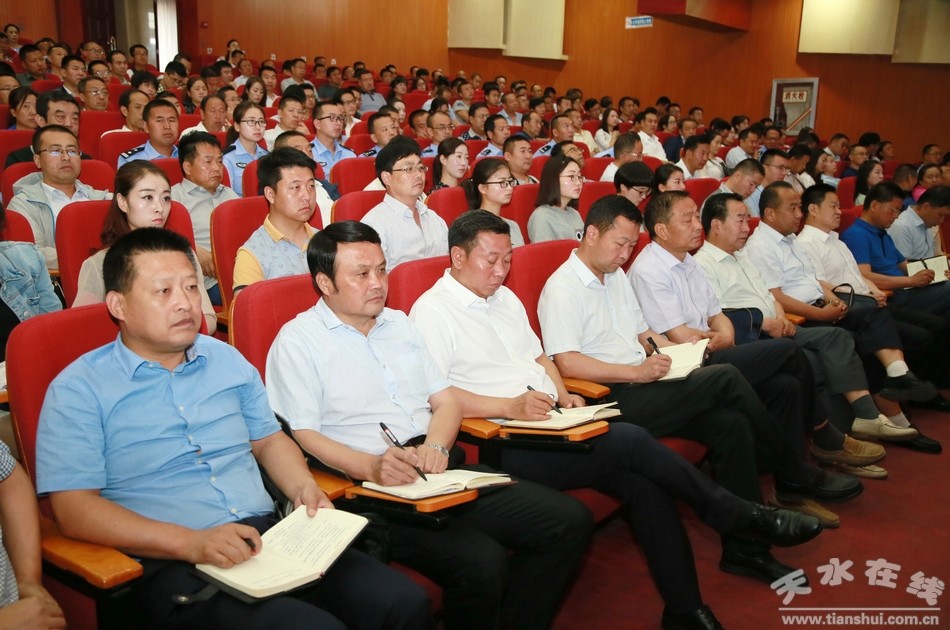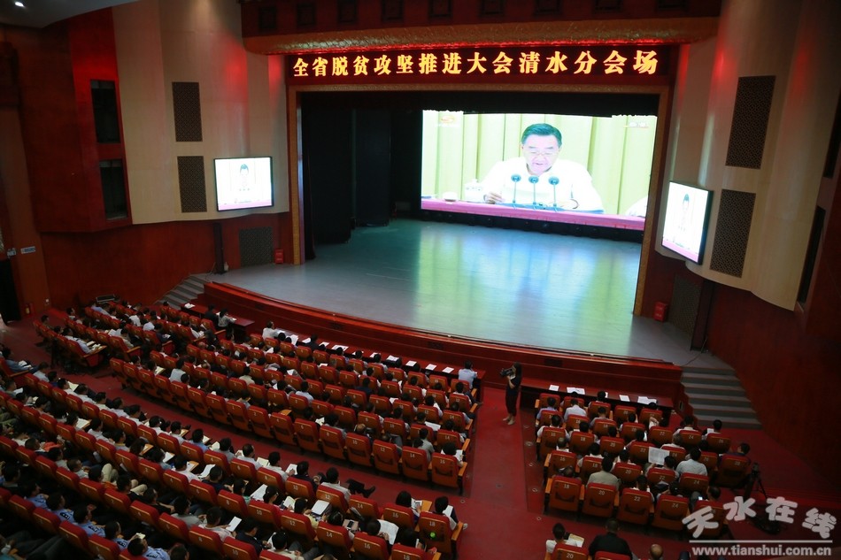 为及时、准确传达这次全省精准脱贫攻坚推进大会精神,清水县设立县、乡镇分会场,县上分会场设在轩辕大剧院。县直及驻县各部门、单位以口组织干部职工收听收看,党群口在县委视频会议室、综合口在县政府视频会议室、政法口在县公安局会议室、宣教口在县教体局会议室、农口在县水务局会议室、经贸口在县工信局会议室;各乡镇组织全体干部、各村村组干部、除主会场参会人员外的第一书记、帮扶工作队队长在本乡镇收看收听。