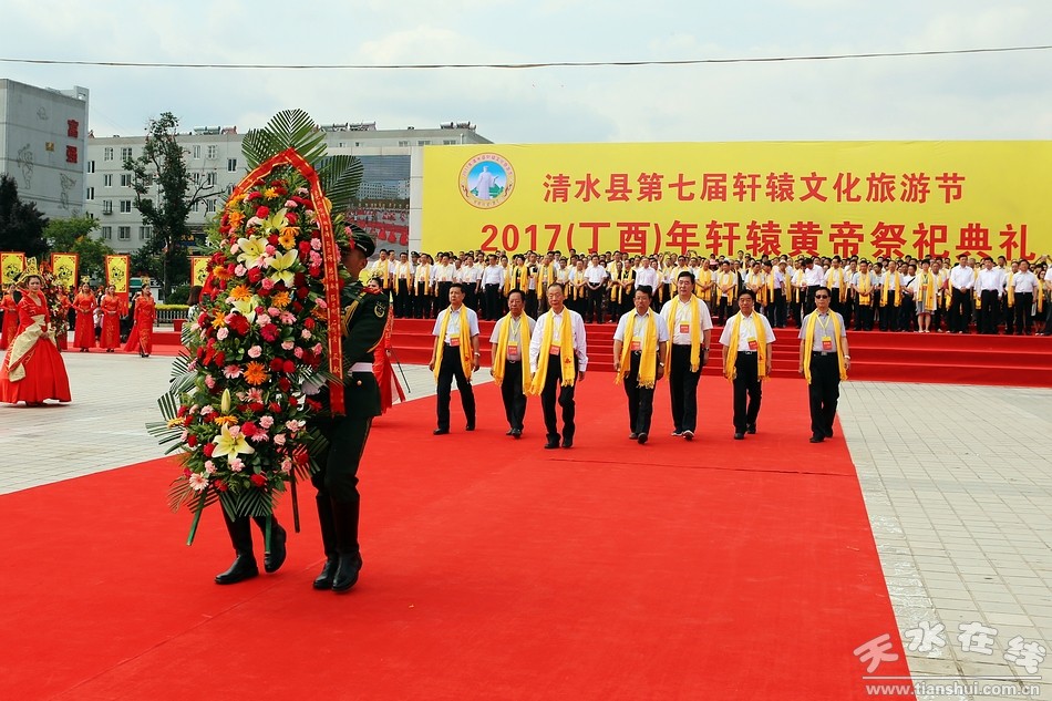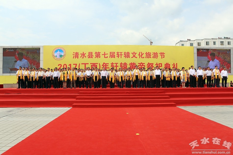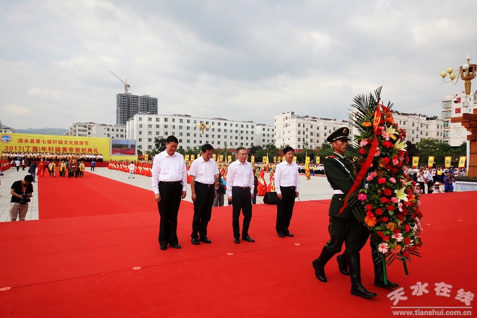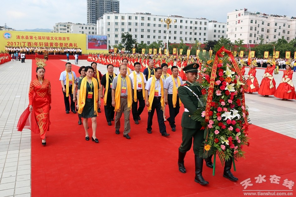 出席今天祭祀典礼的领导和嘉宾有:中共甘肃省委原副书记、省关工委主任李虎林,甘肃省人大常委会原副主任李膺、程有清,甘肃省政协原副主席张景辉,甘肃省军区原副政委杨耀春、原副司令员张臣刚、原政治部主任石新贵;中共天水市委书记王锐,天水市人大常委会主任王光庆,中共天水市委副书记、市长王军,天水市政协主席张明泰;甘肃省委政策研究室副巡视员傅良君,省委宣传部副部长彭鸿嘉,省委老干局副局长、省关工委副主任吴萍,省政府参事、省城乡发展投资集团有限公司董事长王欢祥,省社科院副院长王俊莲,省畜牧兽医局副局长周生明,省引洮工程建设管理局副局长牛军,省卫计委副巡视员安平,小陇山林业实验局副局长潘德乾;天水师范学院纪委书记李淳,省公路管理局副局长朱晖,省工行资深经理柴新仁;天水市委常委、市委秘书长、政法委书记蒋晓强,市委常委、常务副市长赵卫东,市人大常委会副主任蒲朝晖、刘天波、宋建平,市政府副市长张建杰,市政协副主席王振宇,天水军分区副司令员周力等省直部门有关领导、市直部门、两区四县领导,友好县区、合作院校、帮扶单位领导、轩辕文化研究会会员和清水县四大组织领导、离退休老干部及城乡群众参加了祭祀典礼。