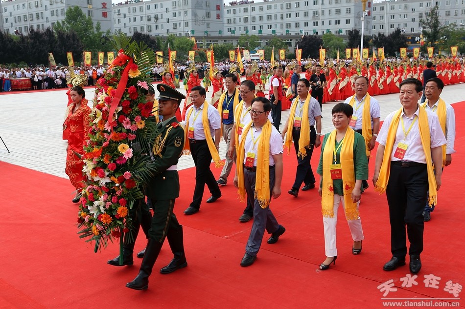 (甘谷县委书记贾忠慧,秦安县委书记王东红,武山县委书记索鸿宾,张家川县委书记陈晰;麦积区人大常委会主任贾应珍,甘谷县人大常委会主任令建民,秦安县人大常委会主任郭海军,张家川县人大常委会主任李肖锋,清水县人大常委会主任周伟东;甘谷县委副书记、县长申君明,秦安县委副书记、县长程江芬,张家川县委副书记、县长马筱宁,清水县委副书记、县长马越垠;麦积区政协主席杨续祥,甘谷县政协主席马骥,秦安县政协主席杨仁义,张家川县政协主席关春生,清水县政协主席丁旺喜,秦州区人大常委会副主任徐生明代表天水市各县区敬献花篮。)