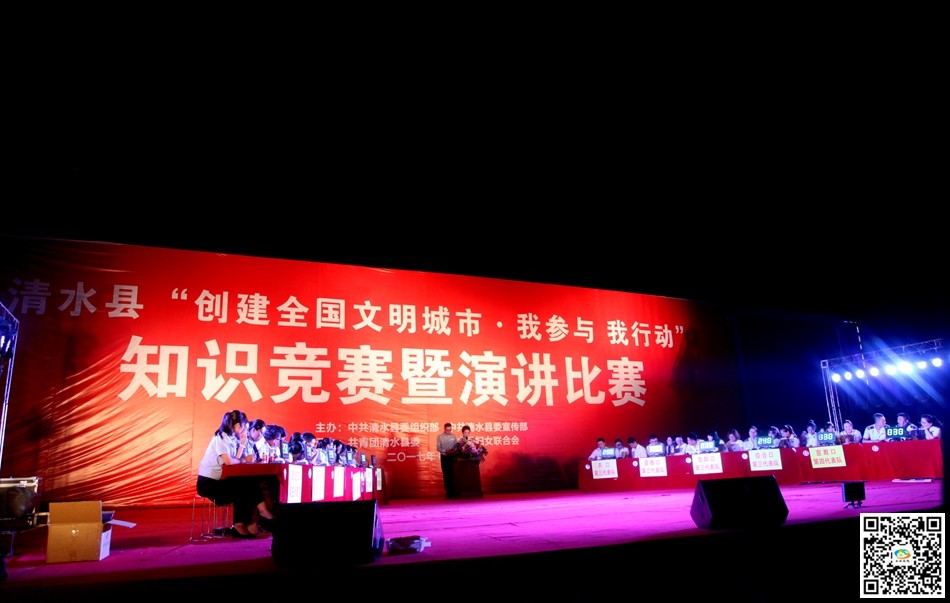 为进一步加大创建全国文明城市的宣传力度,提高广大市民对创建全国文明城市的知晓率、支持率、参与率,普及创建全国文明城市知识,营造良好的创建氛围。7月26日晚,清水县在轩辕广场隆重举办“创建全国文明城市·我参与我行动”知识竞赛。