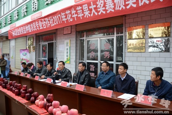 王新强指出,清水县金集镇金果果品种植农民专业合作社举办2017年花牛苹果大奖赛颁奖仪式,这是深入学习贯彻习近平总书记系列重要讲话精神和治国理政新理念、新思想、新战略,也是坚持不懈做大做强果品区域富民产业的重要举措,对持续提升全县果品产业知名度和影响力、拓宽销售渠道、助推精准扶贫精准脱贫起到重要的推动作用。