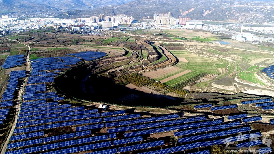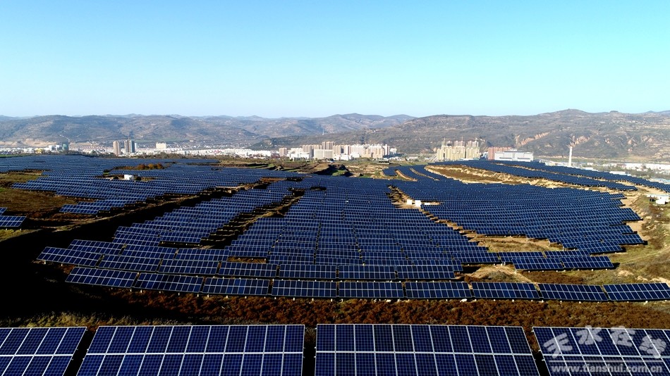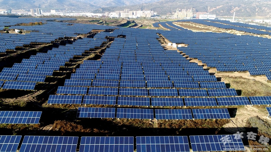 近日,笔者探访了清水县首座集中式光伏扶贫电站项目建设现场,一排排整齐地太阳能光伏发电板,闪闪发光的蓝色多晶硅组件仰面迎着阳光,吸吮着太阳的能量,呈现一道亮丽的风景线。